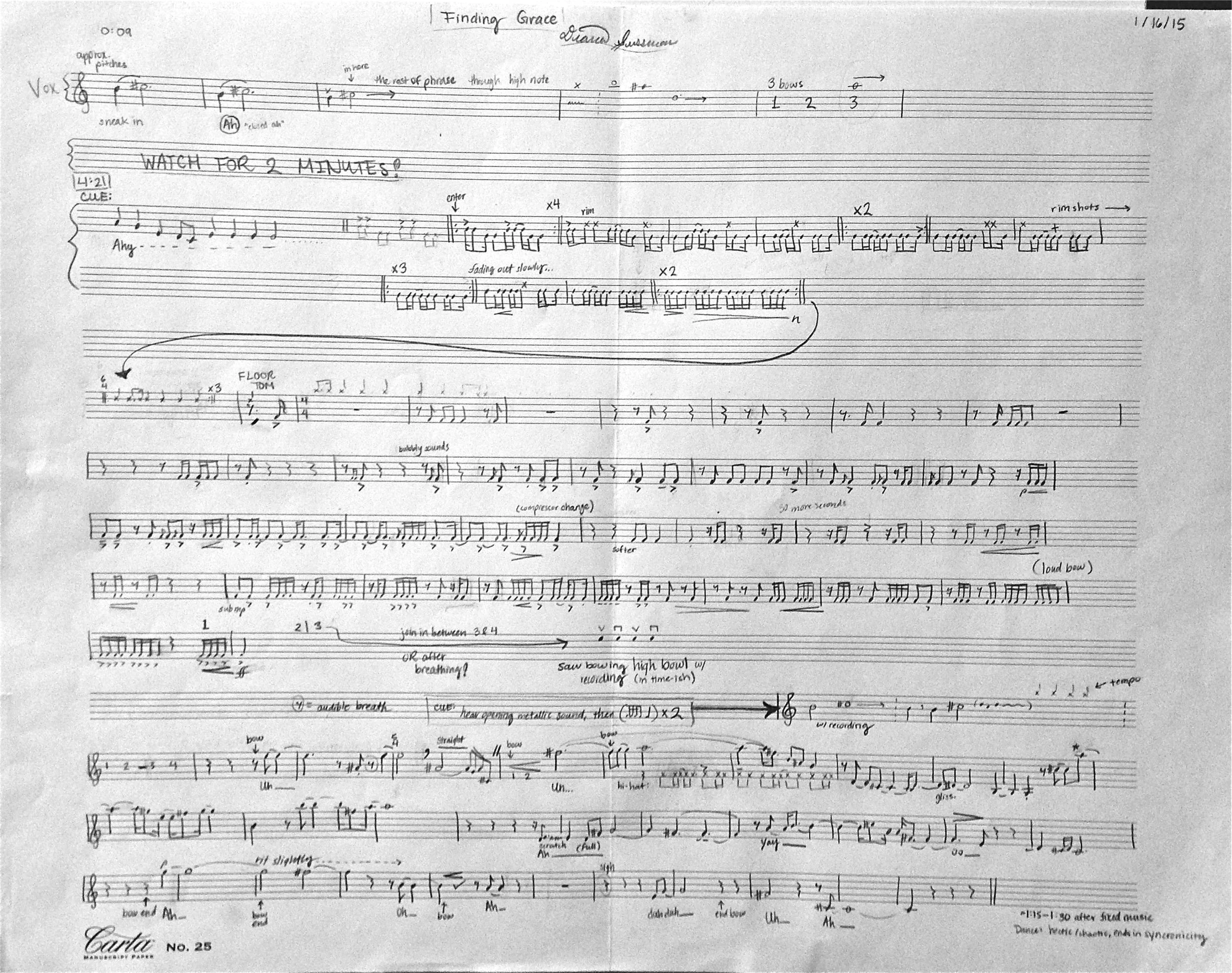 fixed media score with optional live component (for voice, amplified singing bowl mounted on snare drum and low drum)